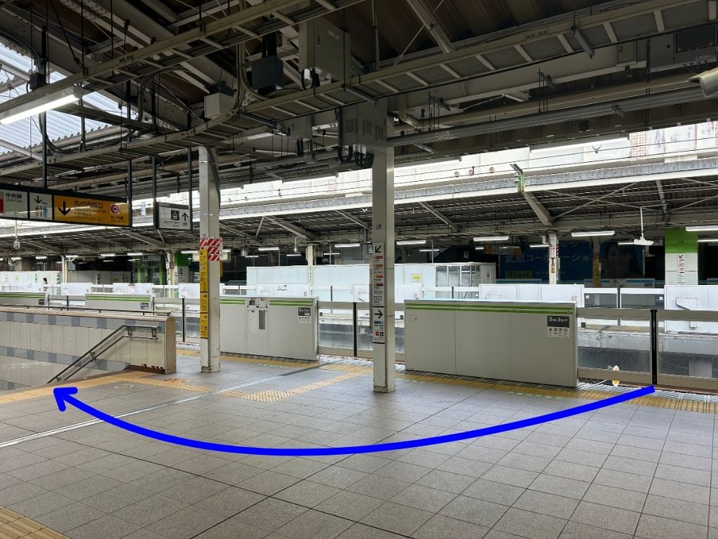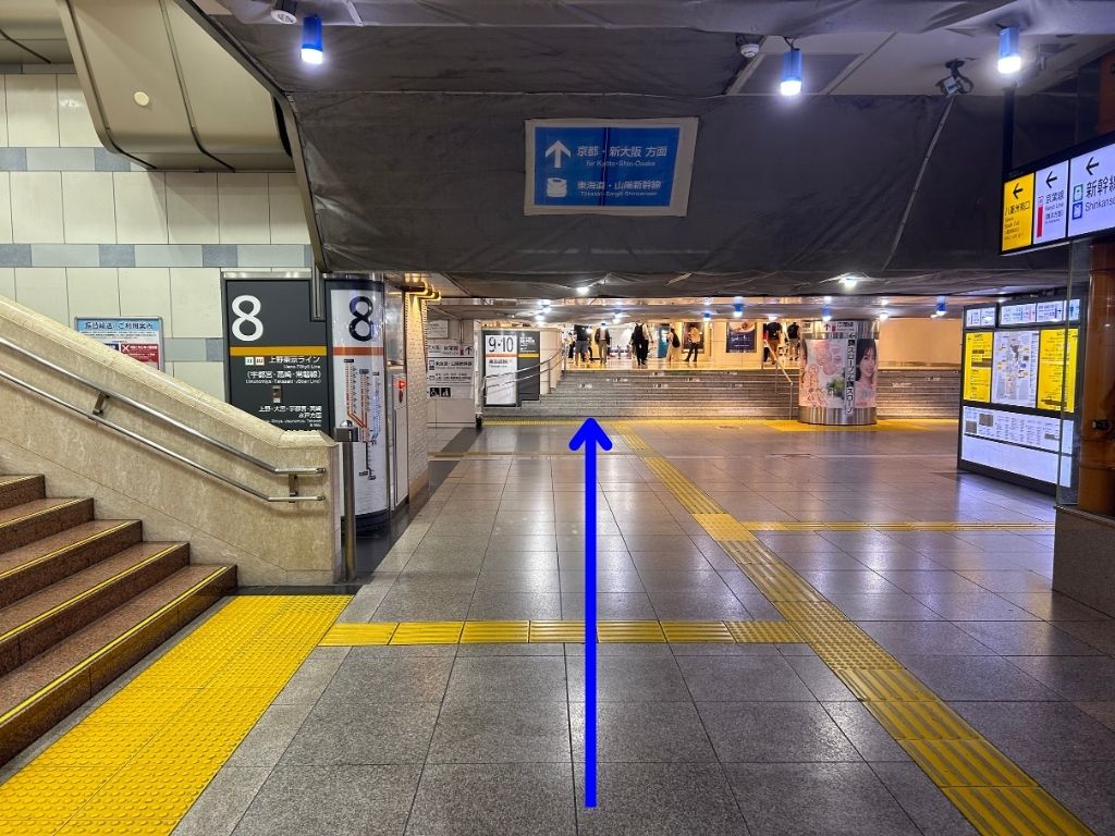 - After arriving at Tokyo Station and getting off the train, go down the stairs on your right ( the following photos assume that you are getting off from Door No.2 of Car No.3).